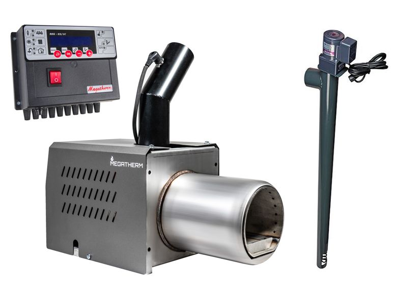 Megatherm Pyro 60 kW, sruuõhuga puhastamise valmidus. Komplektis on põleti, kontroller REG-03 ja etteandetigu 1,5 m.